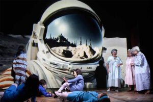 Mondtags berührendes Gruppenporträt endet in dystopischen Visionen, reagiert auf das aktuelle rechte Klima ästhetisch aber nicht kämpferisch sondern mit Hüzün, einem schicksalsergebenen Lebensgefühl und einem traumverlorenen Soundtrack. Seine Bühne verdichtet Vergangenheit, Gegenwart und Zukunft als bedrückende Raumerfahrung, gegen den ein Frauenchor immer wieder mit einer vitalen Form der Melancholie ansingt.