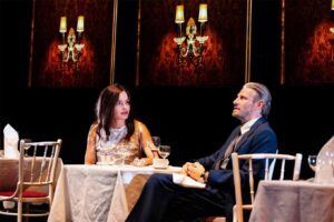Mit Scham und Schuld blickt diese Millionenerbin auf die familiäre Vorgeschichte und das Unternehmen ihres Großvaters, das sich an Kriegswirtschaft und mit Zwangsarbeitern aus KZs bereicherte. Später wird Stepahnie Eidt eine blasierte Agenturbetreiberin verkörpern, die einem Homosexuellen-Paar bei der Erfüllung des Kinderwunsches hilft, indem sie für teures Geld eine Leihmutterschaft organisiert. Obwohl Robert Legage auch hier Szenen größter theatraler Einfachheit und Klarheit inszeniert, mäandert der große epische Strom seiner fünfstündigen Aufführung nun in etwas seichteren Gefilden. Also als Edelboulevard mit Netflix-Dramaturgie. Was aber diesen gewaltigen theatralen Wurf dann doch von dieser Form des menschelnden Entertainments abhebt, ist seine geradezu abenteuerliche Bühnenphysik und der mit ihr fabrizierte Illusionismus. Denn das, was das Publikum da zum Träumen, Lachen und Weinen bringt, es im Eiltempo durch Landschaften, Epochen und Ideenräume trägt, ist ja nichts als im Hier und Jetzt operierende Bühnentechnik und ein exzellentes siebenköpfiges Ensemble: Christoph Gawenda spielt im dritten Akt „Krieg“, unter der Herrschaft des Pique-Blattes, einen traumatisierten Afganistan-VetaranenBastian Reiber und Damir Avdic spielen, nachdem das Herz-Ass aufgeleuchtet hatte, also in „Liebe“, ein verdruckstes Homosexuellen-Pärchen, das sich um perfekte Schwangerschaftsbedingungen der ukrainischen Leihmutter sorgt.