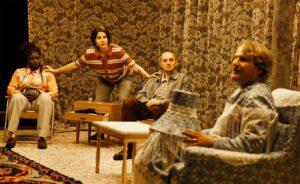 Die Verkehrsinsel vom Anfang verschwindet im Bühnenhimmel, und wird zur Decke über einem von Spitzenvorhängen eingerahmtem Innenraum. Der steht für die untergehende Welt der in Bosnien gebliebenen Großmutter. „Als meine Großmutter Kristina Erinnerungen zu verlieren begann, begann ich, Erinnerungen zu sammeln.“ Sagt der Roman und die Theaterbearbeitung. Aber all die Erinnerungen wollen sich nicht zu der einen großen Narration zusammenfügen, aus der sich eine Zusammengehörigkeit, ein schöner Lebenslauf, eine schicke Weltanschauung, oder irgend ein anderes geschlossenes Bild formen ließe. So ist wohl das Leben, und vielleicht löst genau das Wut und Gewalt bei Menschen aus, die einfache Weltbilder brauchen und die jetzt am rechten Rand immer mehr werden.